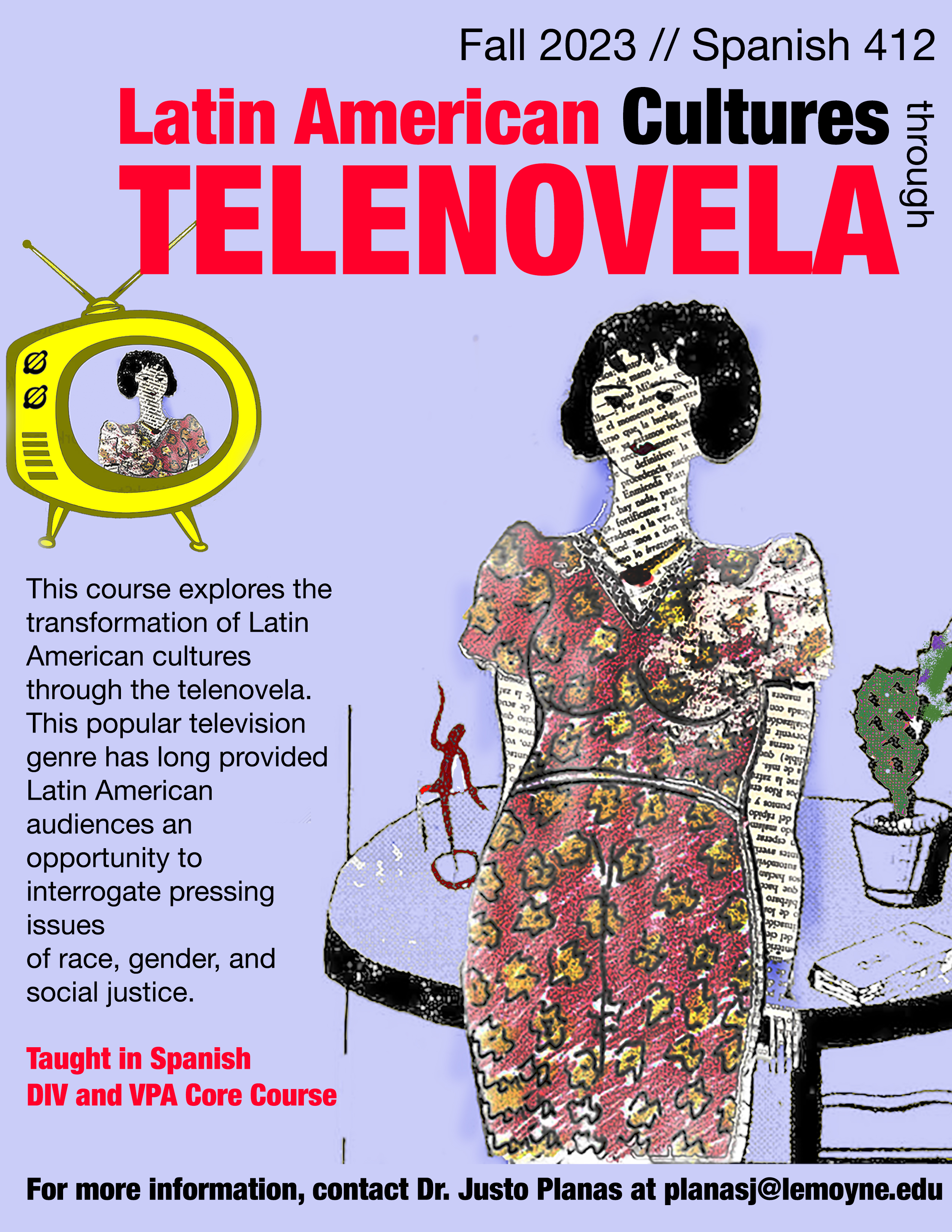 This course explores the transformation of Latin American cultures through issues of race, gender, and social justice, as well as interdisciplinary topics in history, social sciences, politics, and economics. The class will examine how telenovelas introduce these intersectional and interdisciplinary issues to working-class Latin American viewers. Although telenovelas (soap operas) are widely stigmatized in academia, they have served as a long-term referent for the Latin American general public to reflect on pressing social topics. As the philosopher Jesús Martín Barbero asserts, telenovelas have shaped Latin America’s collective imagination of the historical past, present, and future for many decades. A significant part of the course also examines the misrepresentations of diverse communities in Spanish-speaking mainstream media. Additionally, students will engage with literary, visual, and musical products ranging from canonical novels to less prestigious art forms, including narcocorridos, tattoos, and fashion.